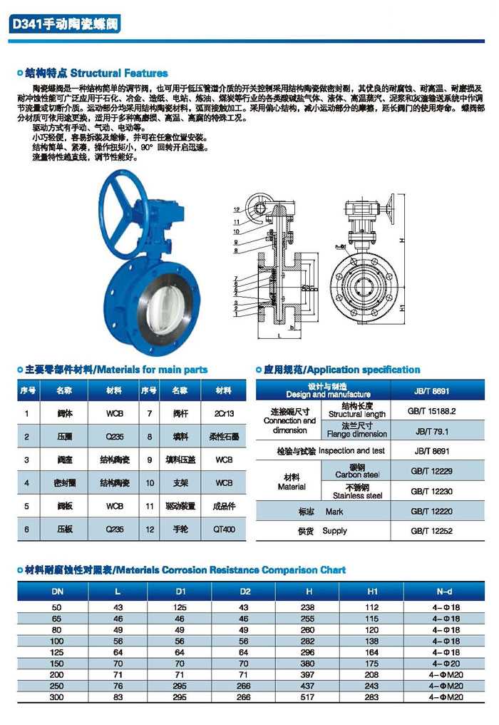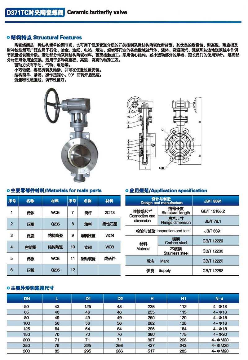 产品规范: 设计规范:JB/T 8527 结构长度:GB/T 12221 连接标准:GB/T 9113 压力试验:JB/T 9092 产品标识:GB/T 12220 供货规范:GB/T 12252 主要零部件材料: 主体:碳钢(WCB)、不锈钢(CF8、CF8M、CF3、CF3M)等 蝶板:不锈钢 阀杆:不锈钢 填料:橡胶/聚四氟乙烯/编织石墨 公称通径:DN50-DN500(2"-20") 公称压力:PN6-PN25 适用温度:-29~+425 操作方式:手轮,伞齿轮、气动、电动、液动、电液(可选) 适用介质:纸浆、污水、煤浆、矿渣等磨损性介质 陶瓷蝶阀,D371TC陶瓷蝶阀参数尺寸图: