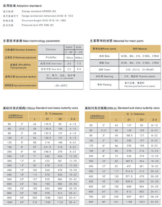 | 蝶阀尺寸小,重量轻,可在各种介质管道中作为截断、调节流量的设备。通过选用不同材质的阀板和密封座,以及板、轴通过无销连接可用于更恶劣的工况,如脱硫、真空、海水淡化系统等。凸耳对夹式蝶阀可实现阀门的下游管线及设备在线修复,并且该阀可实现阀门的下游管线及设备在线修复,并且该阀可安装在管端作为排气阀使用。 |