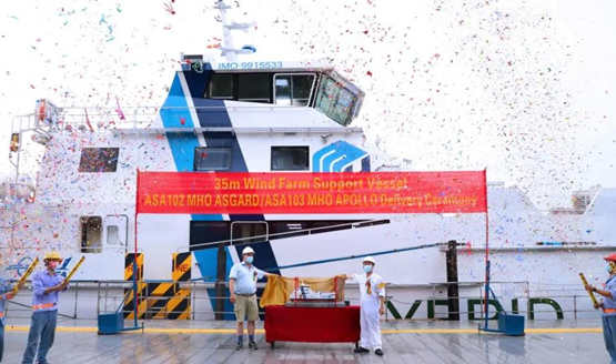 2021年6月28日,英辉南方造船(广州番禺)有限公司成功交付“ASGARD”和“APOLLO”两艘高性能混合动力风电运维船。在中国共产党成立100周年来临之即,英辉南方以优异的建造水平、过硬的产品品质,为中国共产党建党100周年献礼!