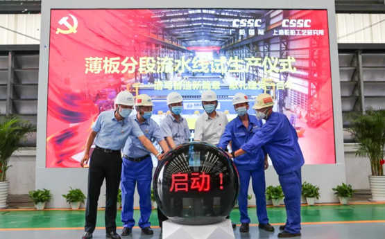 广船国际有限公司党委书记、董事长陈忠前,总经理陈激,副总经理金利潮、欧传杰,上海船舶工艺研究所所长王国忠,副所长杨润党等领导和嘉宾出席薄板分段流水线试生产仪式并共同启动流水线试生产。