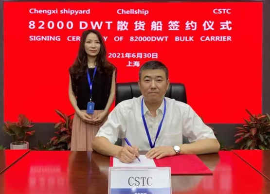 6月30日,中国船舶集团旗下中船贸易联合中船澄西与CHELLSHIP公司通过云签约方式签署1艘8.2万吨散货船订单。CHELLSHIP、中船澄西、中船贸易代表分别在造船合同上签字。