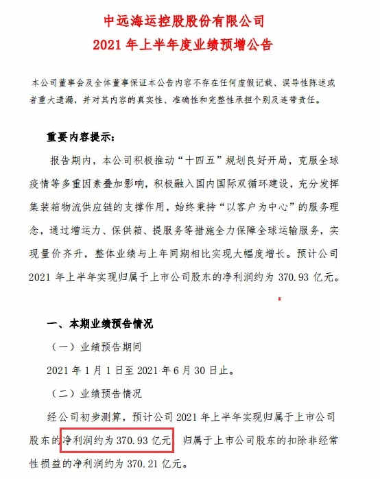 中远海控7月7日晚间披露业绩预告,上半年预盈370.93亿元,同比增长3162%,上年同期净利润为11.37亿元。以半年183天计算,这只曾被称为“亏损王”的航运股,如今每天要净赚2亿元。