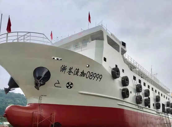 “浙苍渔加08999冷藏加工船”为钢质、双底、单机、单浆、尾机型散货船。总长65米、型宽12.35米、型深12.35米、设计吃水4米、载重量为1053.1T。