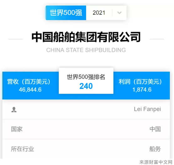 北京时间2021年8月2日,《财富》中英文网站同时发布2021《财富》世界500强排行榜,中国船舶集团有限公司以468.446亿美元的营业收入位列全球榜单第240位。