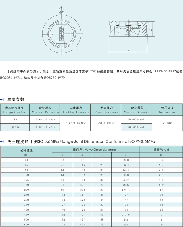 船用不锈钢蝶型止回阀结构图与尺寸表